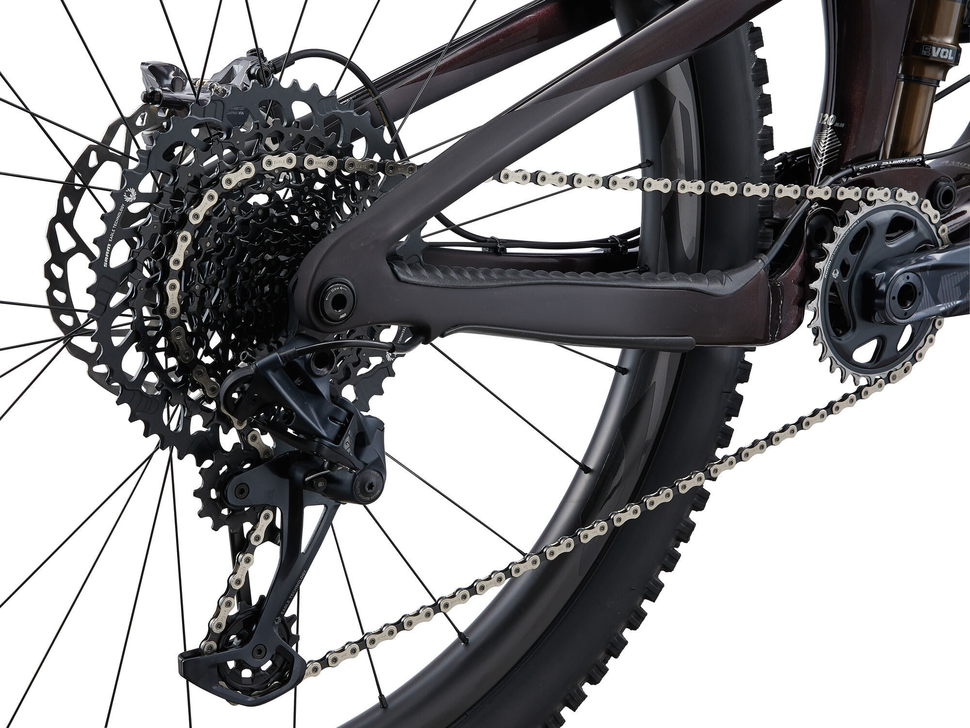 Style | Shred hard and shred fast with this lively 29er. It's built on an all-new full-composite frame with adjustable geometry, giving you smooth control to blitz technical trails at speed.Advanced Composite Technology - Giant's High Performance Grade raw carbon material is used to produce this custom frame material in our own composite factory with a high stiffness-to-weight ratio. The front triangle of these framesets is assembled and molded as one continuous piece in a proprietary manufacturing process called Modified Monocoque Construction. Advanced Forged Composite Technology - A state-of-the-art high-pressure moulding process is used to produce complex-shaped carbon fibre components that are lighter, stiffer and stronger than similar components made from aluminium. This technology is used in critical performance parts such as Maestro Suspension rocker links. Maestro Suspension Technology - Four strategically positioned pivot points and two linkages all work together to create a single floating pivot for the most active, efficient and independent suspension system on the trail. OverDrive - Giant's original oversized fork steerer tube technology. Designed to provide precise front-end steering performance, the system's oversized headset bearings (1 1/4" lower and 1 1/8" upper for road, 1 1/2" lower and 1 1/8" upper for mountain) and tapered steerer tube work in conjunction to provide optimal steering stiffness. Tubeless System - Fewer flat tires. Greater traction. Less rolling resistance and a smoother, faster ride. Giant's Tubeless System makes it easier than ever to experience all these benefits. Flip Chip - Maestro - The flip chip allows riders to quickly adjust the geometry of their Maestro-equipped mountain bike to better suit how and where they ride. It lets riders change the headtube/seattube angles and bottom bracket height via eccentric (offset, two-position) hardware located on the upper rocker arm. Specifications:Sizes S, M, L, XLColours Gloss Cordovan/Matt Cordovan Frame Advanced-Grade Composite front and rear triangles, Maestro Suspension with flip chip, 120mm travel, 12x148mm thru-axle, wheelsize 29" only F&R Fork Fox 34 Factory Live Valve, 44mm offset,130mm travel, Boost 15x110 Kabolt, Tapered Shock FOX Factory Live Valve Trunnion 185x50, custom tuned for Giant Handlebar Giant Contact SLR TR35, 780x35mm, 20mm rise, Carbon Grips Giant Tactal Pro Single S:120mm, M:120mm, L:130mm, XL:130mm Stem Giant Contact SL 35 S:40mm, M:40mm, L:40mm, XL:40mm Seatpost TranzX travel-adjustable dropper, remote S: 120-150mm travel / 30.9 x 459mm M: 140-170mm travel / 30.9 x 499mm L: 170-200mm travel / 30.9 x 525mm XL: 170-200mm travel / 30.9 x 525mm Saddle Giant Romero SL Pedals PEDALS NOT SUPPLIED Shifters SRAM GX Eagle, 1x12 Front Derailleur Rear Derailleur SRAM GX Eagle Brakes Shimano XT M8120, Hydraulic Disc, 4 piston, [F] 180mm [R]180mm Brake Levers Shimano XT, BL-M8100 Cassette SRAM GX XG 1275 10x52 Chain SRAM GX Eagle Crankset SRAM GX, 30T, 55mm chainline Bottom Bracket Shimano, press fit Rims Stronger than ever, the new TRX 2 29" hookless carbon wheelsystem and 30mm rim inner width provides best-in-class strength, durability, stiffness, efficiency and lightweight tuned for the most challenging Trail/Enduro riding scenario Hubs Front : Giant MTB alloy, 6-bolt, [R] Giant MTB alloy, 3-pawl driver, 6-bolt Spokes Sapim Tyres [F] Maxxis Minion DHF 29x2.5 WT, 60 TPI, 3CMaxTerra , EXO, TR, [R] Maxxis Aggressor 29x2.5WT, 60 TPI,Dual, EXO, TR Extras Factory tubeless set up including sealant, Max Tyre Clearance 2.6" Max Chainring Size 34t |