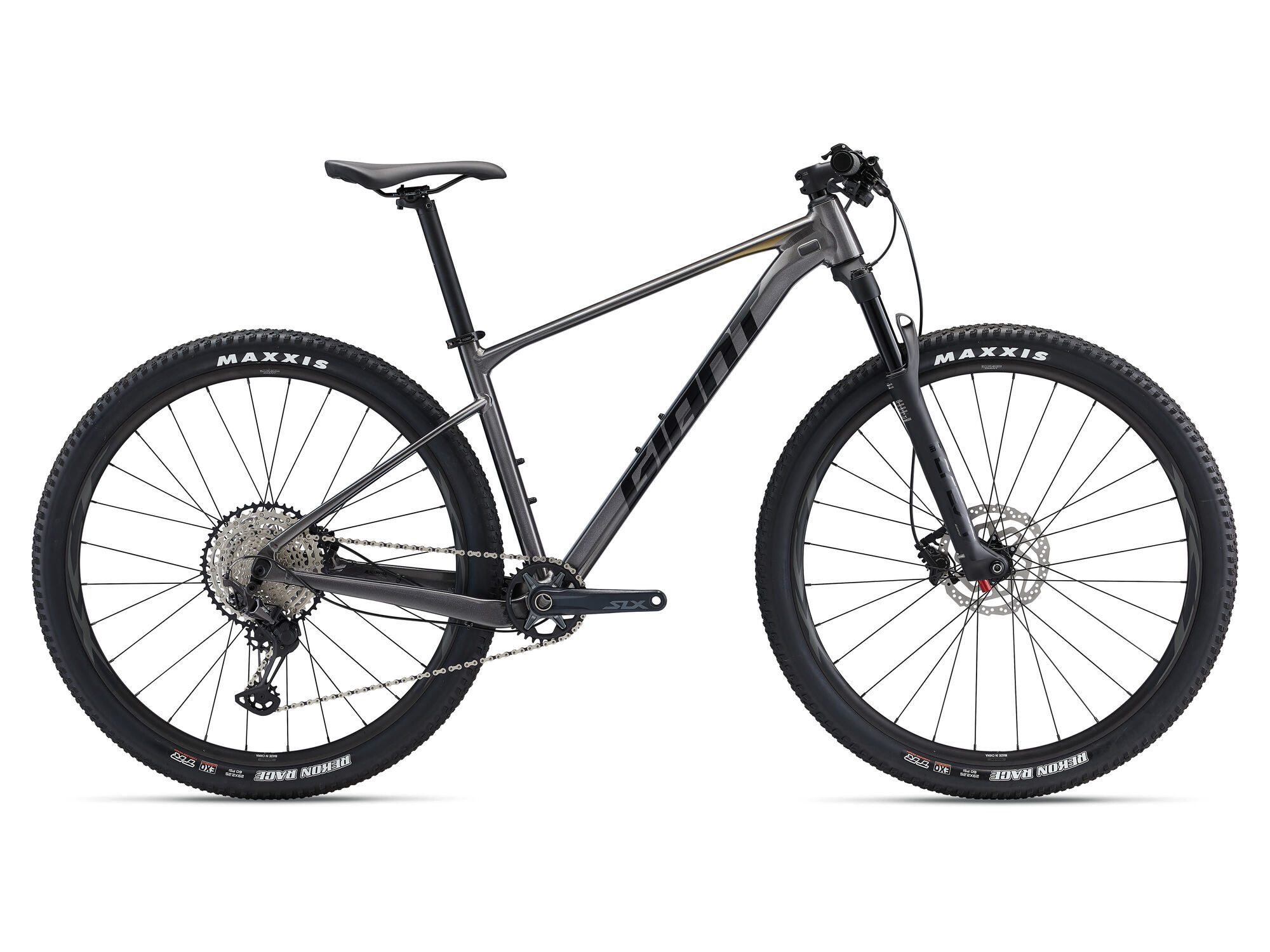 | Style | Hammer up climbs, accelerate on smooth single track, carry your speed as the trail dips and dives. This lightweight aluminium 29er delivers efficiency and balanced control.ALUXX SLR Aluminium Technology - This superlight Pro level aluminium material is made predominantly from 6011 alloy and delivers the highest strength-to-weight ratio of any Giant aluminium frameset. State-of-the-art microscopic grain manipulation and advanced butting allow for 20 percent thinner and lighter tube shapes than ALUXX SL framesets. OverDrive - Giant's original oversized fork steerer tube technology. Designed to provide precise front-end steering performance, the system's oversized headset bearings (1 1/4" lower and 1 1/8" upper for road, 1 1/2" lower and 1 1/8" upper for mountain) and tapered steerer tube work in conjunction to provide optimal steering stiffness. Tubeless System - Fewer flat tires. Greater traction. Less rolling resistance and a smoother, faster ride. Giant's Tubeless System makes it easier than ever to experience all these benefits. Specifications:Sizes S, M, L, XLColours Metallic Black Frame ALUXX SLR-Grade Aluminum Fork Giant Crest 34 RRL, 100mm, 15x110, remote lockout Shock Handlebar Giant Connect XC, 740x31.8mm Grips Giant Sole-O Stem Giant Contact S:60mm, M:70mm, L:80mm, XL:90mm Seatpost Giant Connect, 30.9mm S:375mm, M:375mm, L:400mm, XL:400 Saddle Giant Sport Pedals PEDALS NOT SUPPLIED Shifters Shimano SLX M-7100, 1x12 Front Derailleur Rear Derailleur Shimano Deore XT M-8100 Brakes Tektro TDK 143 hydraulic disc brakes, rotors [F]180mm, [R]160mm Brake Levers Tektro TDK 143 Cassette Shimano SLX, 10x51 Chain KMC X-12 Crankset Shimano SLX, 32t S:170mm, M:175mm, L:175mm, XL:175mm Bottom Bracket Shimano cartridge, press fit Rims Giant XCT 29" alloy, 25mm inner width Hubs Shimano MT410B, sealed Spokes Stainless steel Tyres Maxxis Recon Race 29x2.25, foldable, TLR, EXO, tubeless Extras Factory tubeless set up Max Tyre Clearance 2.4" Max Chainring Size 36t |