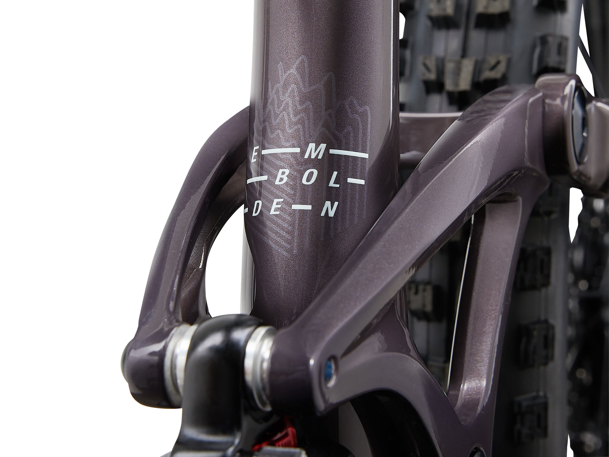 | Style | Nothing is off-limits to the Embolden, a trail bike designed to conquer tricky climbs, rowdy descents, and chunky rock gardens with confidence.ALUXX Aluminium Technology - This Performance level frame material features 6061 alloy with single-butted tubes to produce strong, lightweight framesets for a variety of different bikes and riding styles. FlexPoint Suspension Technology - A proven " single-pivot" design that uses the flexing action of the chainstay/seatstay junction to produce a lightweight and durable suspension system with 4.7 inches/120mm of rear travel. OverDrive - Designed to provide precise front-end steering performance, this fork steerer tube technology uses oversized headset bearings (1 1/4" lower and 1 1/8" upper for road, 1 1/2" lower and 1 1/8" upper for mountain) and tapered steerer tube work in conjunction to provide optimal steering stiffness. PowerCore - A massively oversized bottom-bracket/chainstay area features a fully integrated, 86-millimeter wide bottom-bracket design (92-millimeterwide for off-road bikes). Asymmetric chainstays provide additional stiffness on the driveside and stability on the non-driveside. Tubeless System - Engineered with proprietary Dynamic Balanced Lacing technology, this tubeless ready composite WheelSystem delivers superior efficiency, pinpoint control and comfort. Specifications:Sizes 27.5": XS, S 29": M, LColours Gloss Charcoal Plum Frame ALUXX-grade aluminium, 120mm FlexPoint Suspension Fork Giant Crest 34 SL RCL, 140mm, Boost 15x110, 44mm offset Shock Suntour Raidon R, 184x44, custom tuned for Liv Handlebar Giant Contact TR35, 20mm rise, alloy 27.5": XS: 730mm, S: 750mm 29": M: 750mm, L: 780mm Grips Giant Sole-O Stem Giant Contact, 35mm 27.5": XS: 40mm, S: 50mm 29": M: 50mm, L: 60mm Seatpost Giant Contact Switch dropper, remote 27.5": XS: 75mm travel / 30.9 x 295mm S: 100mm travel / 30.9 x 345mm 29": M: 125mm travel / 30.9 x 395mm L: 125mm travel / 30.9 x 345mm Saddle Liv Sylvia Pedals PEDALS NOT SUPPLIED Shifters SRAM SX Eagle, 1x12 Front Derailleur Rear Derailleur SRAM SX Eagle Brakes Shimano MT-420, hydraulic, Shimano RT-26 rotors [F]180mm, [R]180mm Brake Levers Shimano BL-MT401 Cassette SRAM SX Eagle, 11x50 Chain SRAM SX Eagle Crankset SRAM SX Eagle DUB, 30t 27.5": XS: 165mm, S: 170mm 29": M: 170mm, L: 170mm Bottom Bracket SRAM DUB, press fit Rims 27.5": Giant AM 27.5, tubeless ready, sleeve-joint rim, 30mm inner width 29": Giant AM 29, tubeless ready, sleeve-joint rim, 30mm inner width Hubs Giant Tracker Performance Boost 15x110, sealed bearing [R] Giant Tracker Giant Sport 148x12 Spokes Sapim Tyres 27.5": [F] Maxxis Minion DHF 27.5x2.6, EXO, TR, tubeless [R] Maxxis Dissector 27.5x2.6, EXO, TR, tubeless 29": [F] Maxxis Minion DHF 29x2.5 WT, EXO, TR, tubeless [R] Maxxis Dissector 29x2.4 WT, EXO, TR, tubeless Extras Factory tubeless set up Max Tyre Clearance 2.6" Max Chainring Size 32t |