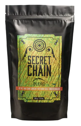 | Description | The Silca Secret Chain Blend brings the same super-speed and silence as Silca's Super Secret Chain Lube but in a hot-melt wax-dipped chain version. The Silca Secret Chain Lube is based on the same formula Silca CEO Josh Poertner has used for years with pro teams that have claimed victories at the highest level of cycling. The idea behind the lube was to bring the same hot melt wax advantage to a drip applied lubricant. However many Silca customers are already fans of hot waxing chains and requested the lube in a hot melt version. So the Silca Hot Melt Wax blend is the answer to their calls. Consisting of highly refined laboratory-grade paraffin and a high concentration of three sizes of Tungsten disulfide the blend not only acts as a lubricant but changes the service of the chain. Filling any crevices of the metal with the highly lubricious and wear-resistant Tungsten disulfide the Secret Chain Blend will get faster over time with repeated waxings. The wax creates an incredibly fast running low-friction chain. The nanoplatelets of WS2 (Tungsten disulfide) has less than 1/3 the dynamic coefficient friction of PTFE and ¼ that of Molybdenum Disulfide (MoS2). The Silca Secret Chain Blend packaging makes hot waxing a chain simple even if you are new to the process. Simply place the chain into the open pouch. Place the pouch into a pot of room temperature water and bring it up to just below boiling point. You should see the wax begin to melt. There is a transparent panel on the side of the pouch so you can check the process. Using a hanging hook bent spoke or zip tie lift the chain carefully out of the pouch leaving it to dry hanging up above the pouch to collect any excess wax. The wax formula has the added benefit of being environmentally friendly and will help extend the chain and drivetrain component lifetime by up to x10. Key features: