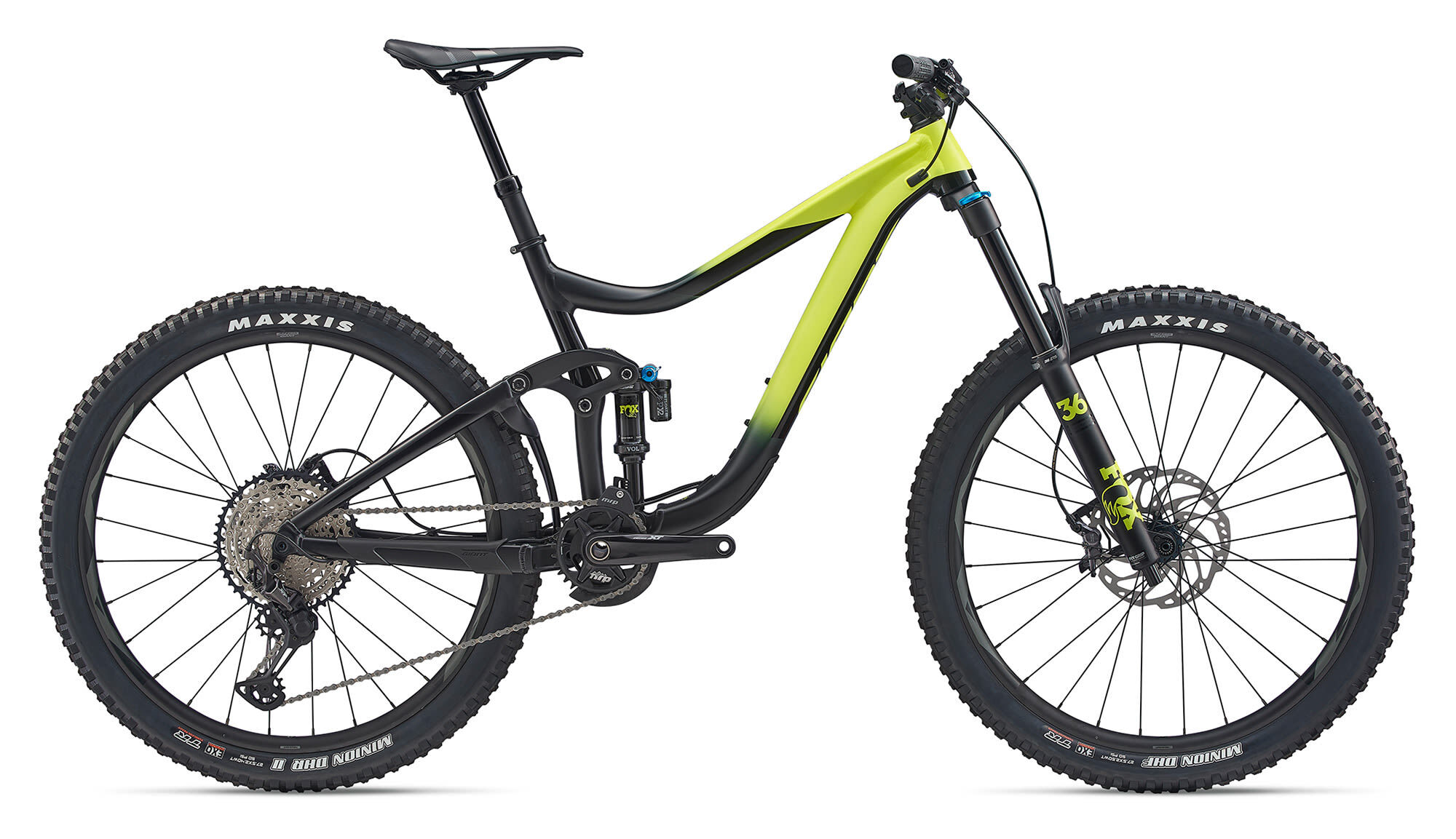 Style | From the bike park to enduro tracks and steep singletrack shredding, this all-mountain bruiser has swagger to spare. The lightweight, super-stiff aluminium frame is long and low, and its Maestro suspension helps you float through the rough stuff.ALUXX SL Aluminium Technology - This High-Performance level, state-of-the-art aluminium material is made predominantly from 6011 alloy and delivers best-in-class strength-to-weight ratios. These framesets also feature unique welding technologies for high-performance ride quality. Advanced Forged Composite Technology - A state-of-the-art high-pressure moulding process is used to produce complex-shaped carbon fibre components that are lighter, stiffer and stronger than similar components made from aluminium. This technology is used in critical performance parts such as Maestro Suspension rocker links. Maestro Suspension Technology - Four strategically positioned pivot points and two linkages all work together to create a single floating pivot for the most active, efficient and independent suspension system on the trail. OverDrive - Giant's original oversized fork steerer tube technology. Designed to provide precise front-end steering performance, the system's oversized headset bearings (1 1/4" lower and 1 1/8" upper for road, 1 1/2" lower and 1 1/8" upper for mountain) and tapered steerer tube work in conjunction to provide optimal steering stiffness. Tubeless System - Fewer flat tires. Greater traction. Less rolling resistance and a smoother, faster ride. Giant's Tubeless System makes it easier than ever to experience all these benefits. Specifications:Sizes S, M, L, XLColours Matte Neon Yellow / Black Frame ALUXX SL-Grade Aluminum, 160mm Fork Fox 36 Float Performance, 170mm, GRIP damper, Boost 15x110 QR, tapered Shock Fox Float DPX2 Performance Handlebar Giant Contact TR35, 780x35mm, 20mm rise Stem Giant Contact SL 35 Seatpost Giant Contact Switch dropper post with remote, 30.9 Saddle Giant Contact (neutral) Pedals Shifters Shimano Deore XT Front Derailleur Rear Derailleur Shimano Deore XT Brakes Shimano Deore XT Brake Levers Shimano Deore XT Cassette Shimano SLX, 10x51 Chain Shimano Crankset Shimano Deore XT, 32t with MRP AMg V2 alloy guide Bottom Bracket Shimano, press fit Rims Giant AM 27.5 tubeless ready sleeve-joint rim, 30mm inner width Hubs [F] Shimano Boost 15x110, sealed bearing [R]Shimano Boost 12x148, sealed bearing Spokes Sapim Tyres [F] Maxxis Minion DHF 27.5x2.5 WT, folding, EXO, TR, tubeless, [R] Maxxis Minion DHRII 27.5x2.4 WT, folding, EXO, TR, tubeless Extras Tubeless prepared |